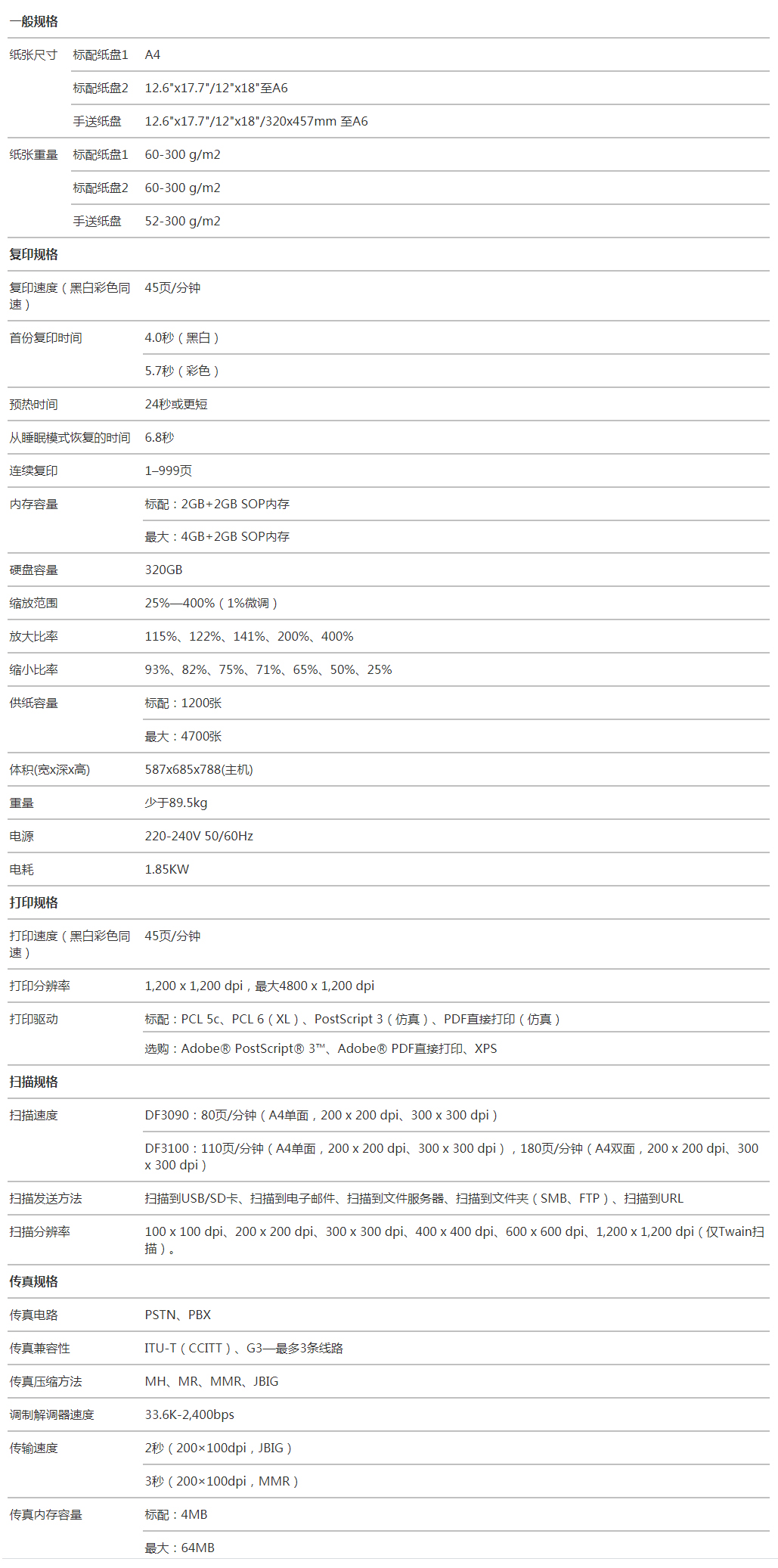 1、10.1英寸大尺寸SOP智能触摸屏,内置V4.2安卓系统 2、内置1.75GHz高速英特尔处理器 3、打印速度分别达到每分钟45页(黑白)/每分钟45页(彩色) 4、最大打印分辨率为4,800dpi×1,200dpi 5,选购250页双面同步扫描自动送稿器,双面扫描速度最高可达到180页/分钟(300dpi) 6、标配2GB内存+2GB SOP系统内存,320GB硬盘 7、预热时间仅需要24秒 8、首页输出时间为4.0秒(黑白)/5.7秒(彩色) |